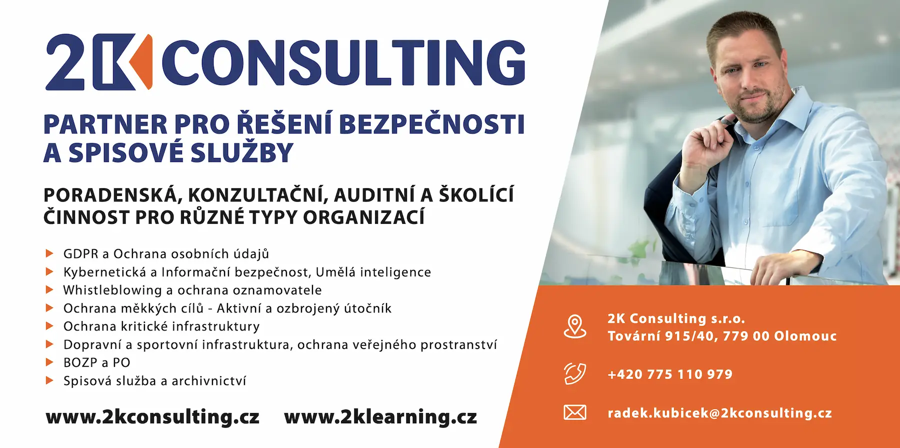 2K CONSULTING s.r.o. je certifikovaná auditní, poradenská a konzultační společnost, která se specializuje na ochranu měkkých cílů, ochranu kritické infrastruktury, fyzickou a objektovou bezpečnost, ochranu osobních údajů (GDPR) a whistleblowing, kybernetickou bezpečnost a informační bezpečnost, spisovou službu a archivnictví. Díky dlouholetým zkušenostem, odbornému zázemí a vysoké kvalitě poskytovaných služeb patří mezi respektované poradenské společnosti v České republice a získala již řadu odborných ocenění.